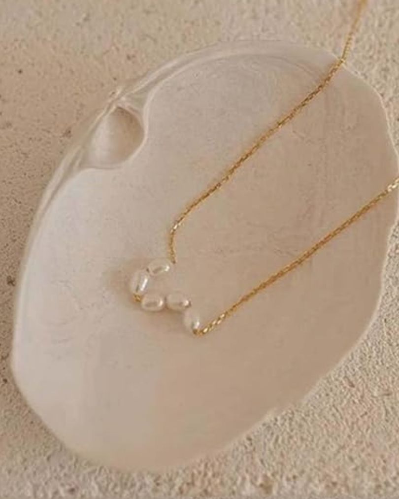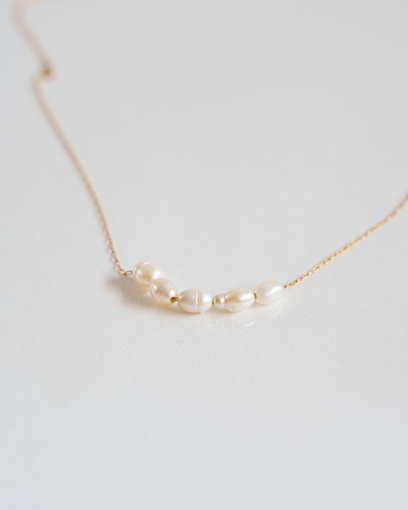 The Tesoro del Mare necklace features five organic baroque pearls, each uniquely shaped, making every necklace slightly different. Delicately suspended on a fine, gold-plated chain, it is crafted with hypoallergenic materials to ensure comfort and safe wear for all skin types.